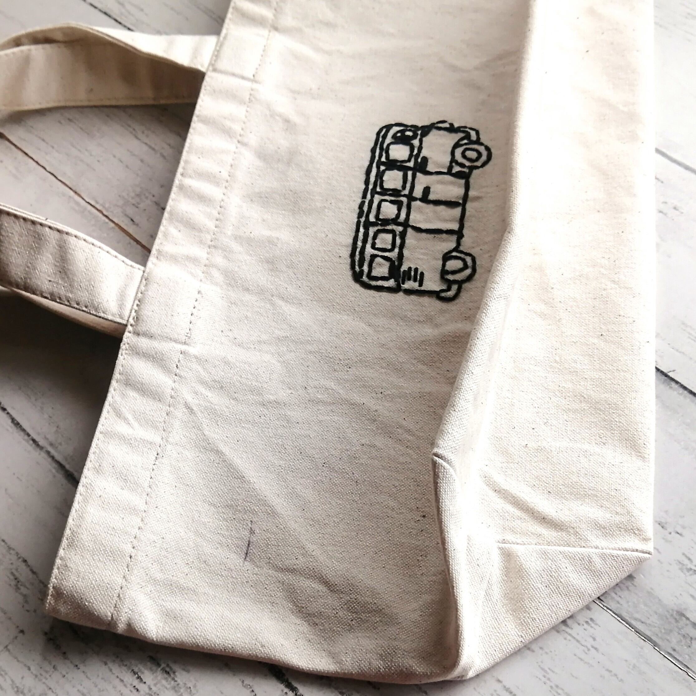 黒いバスを手縫いで刺繍した、丈夫で素材感のあるキャンバスミニトートバッグです。刺繍の裏面は引っ掛かりがないよう、接着芯を貼りました。