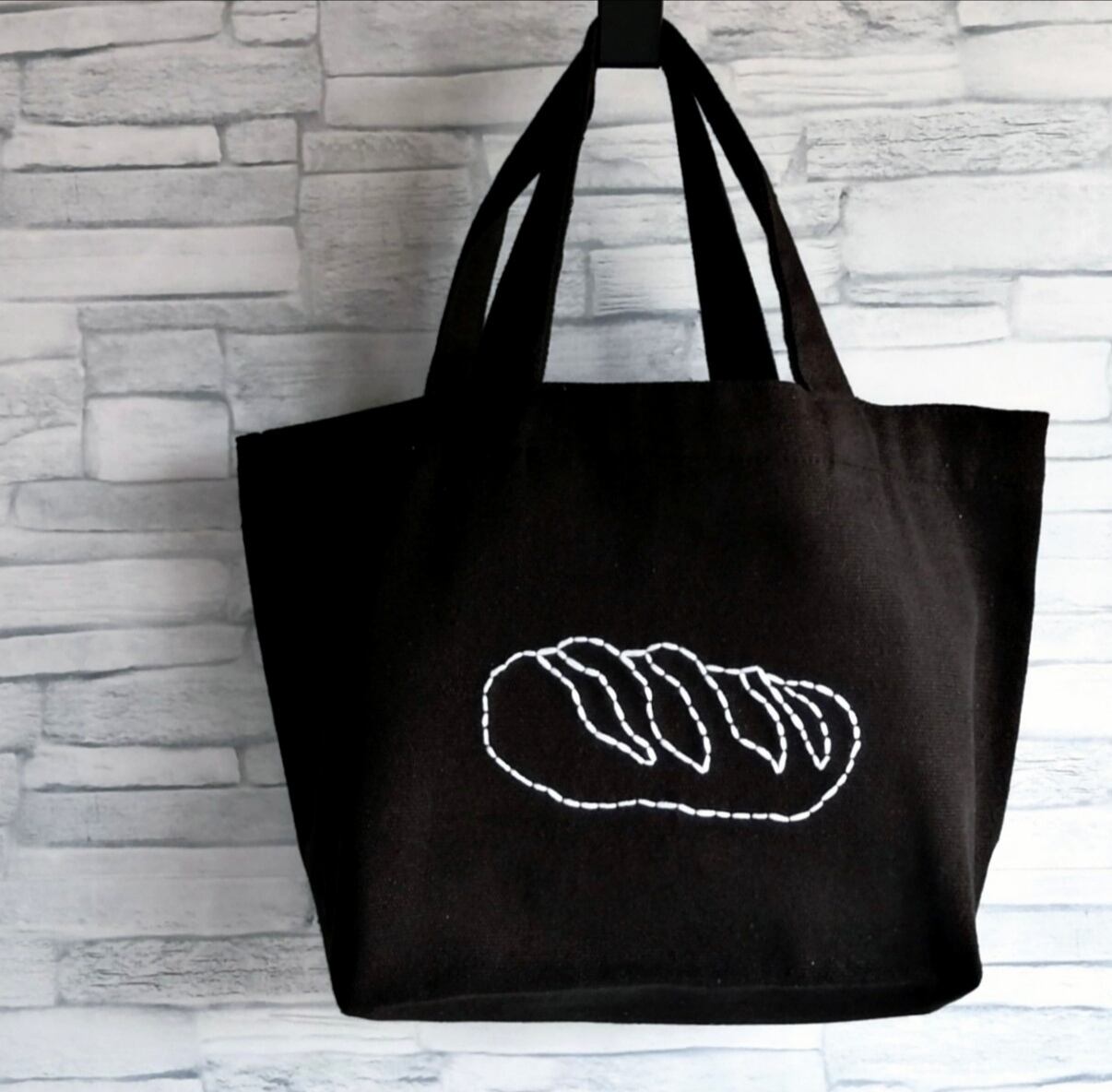 黒の丈夫なキャンバスミニトートバッグに大きな白パンを刺繍しました。手縫いのバックステッチで丁寧に刺しています。刺繍の裏面は引っかからないように接着芯を貼りました。