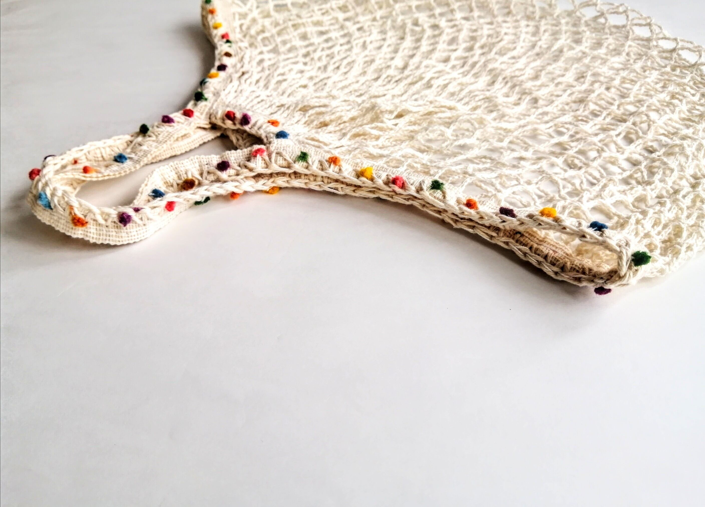 生成りのネットバッグの袋口と持ち手をカラフルな手編みのポンポン毛糸で飾りました。一目一目手編みで丁寧に編んでいます。