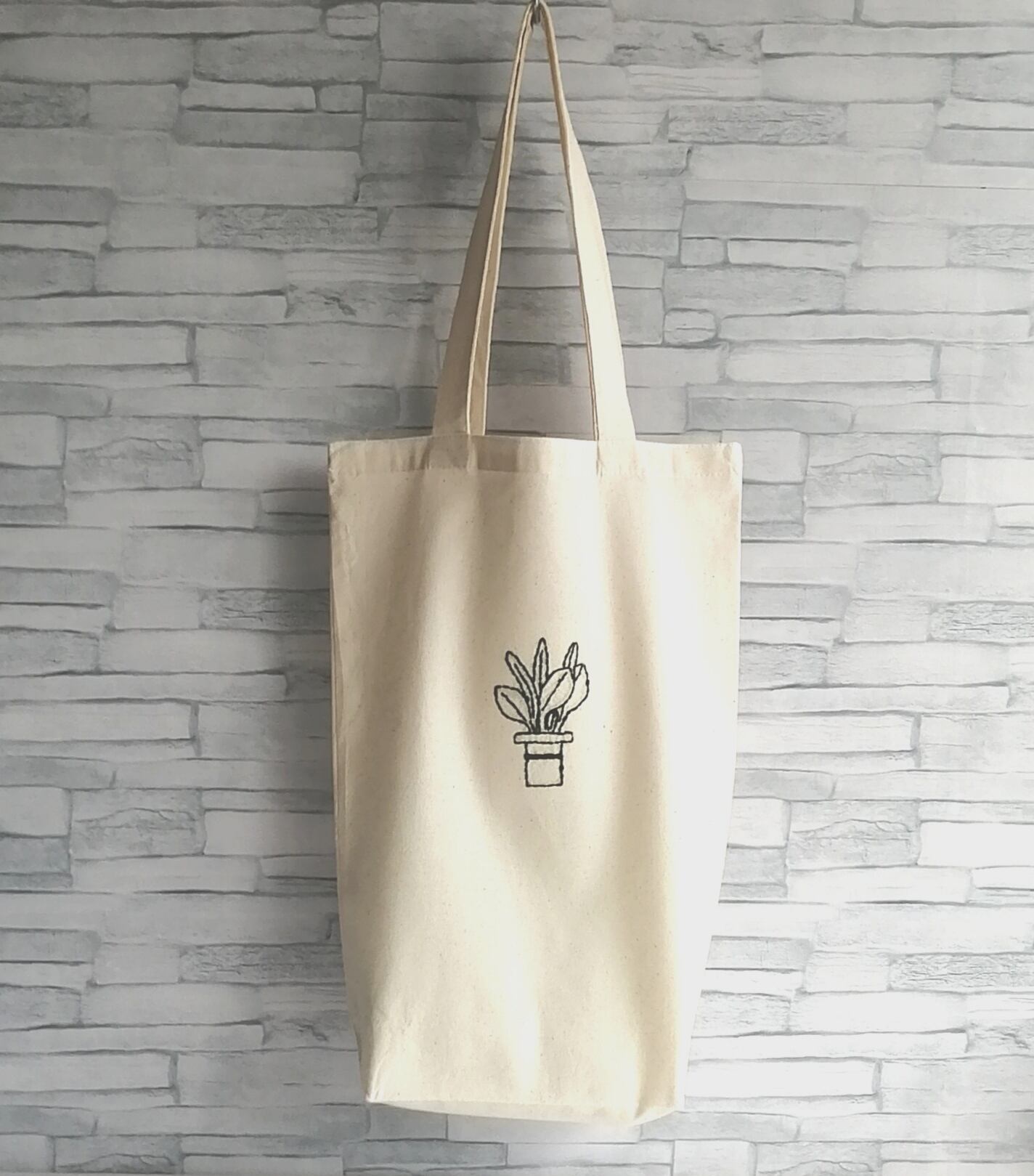 生成りの縦長トートバッグに緑色の観葉植物を刺繍しました。一針一針手縫いのバックステッチで丁寧に刺しています。
