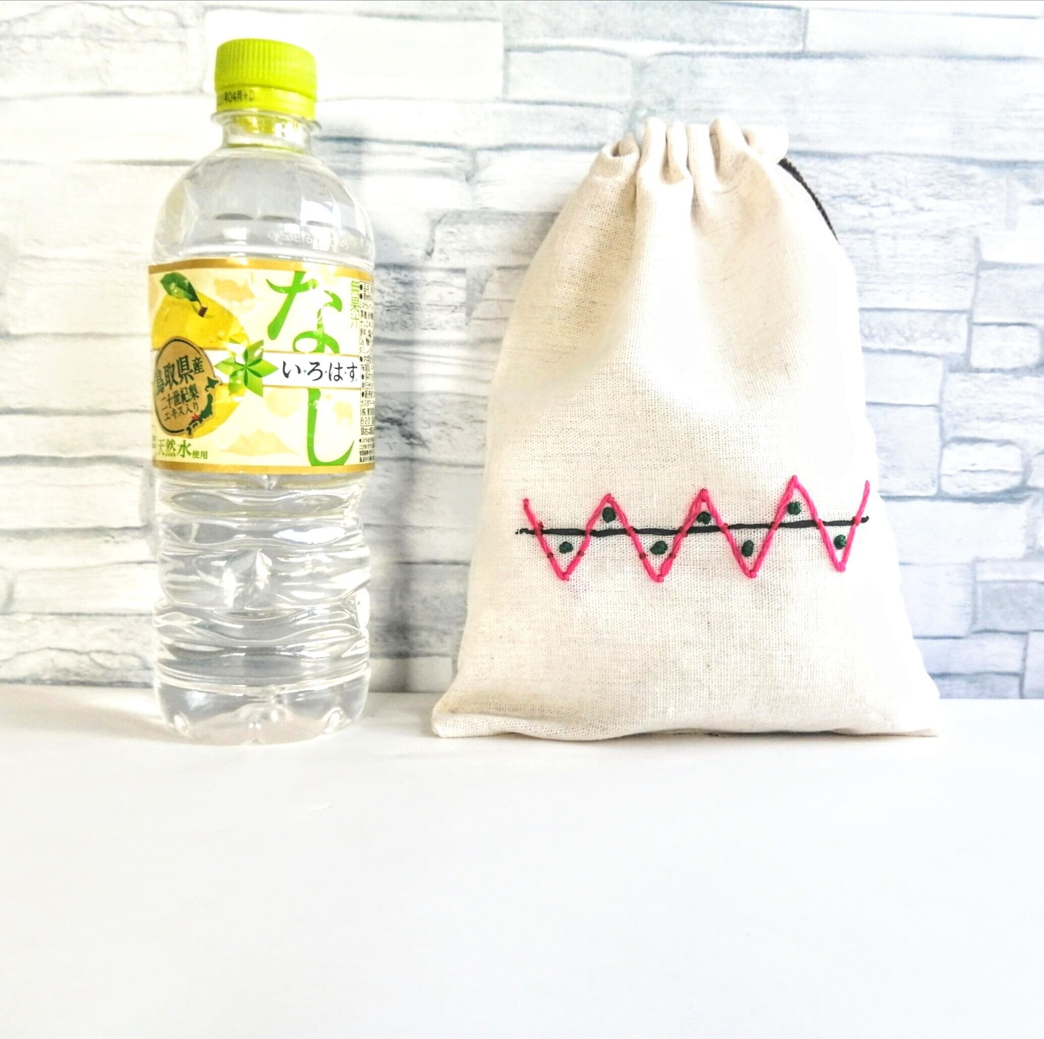 隣に並べたのは555mlペットボトルです。両側から絞るタイプの巾着袋です。化粧ポーチや アクセサリー入れ、数珠入れ。またお子様のお菓子入れなどにも使っていただける、小さくてかわいい巾着ポーチに仕上がりました。