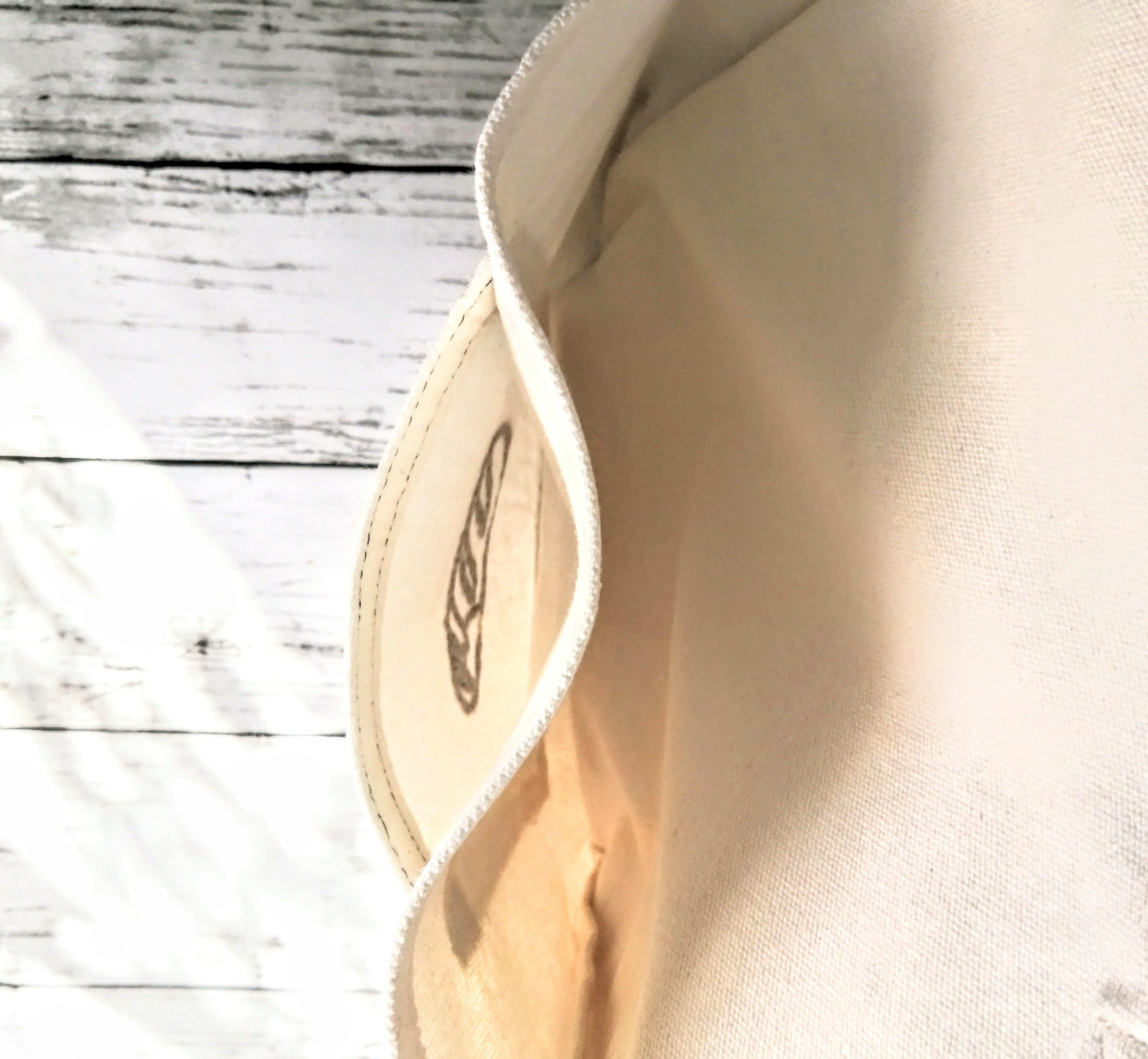2ポケット横長トートバッグ/ボストンバッグに茶色のパンを刺繍した白いポケットを付けました。