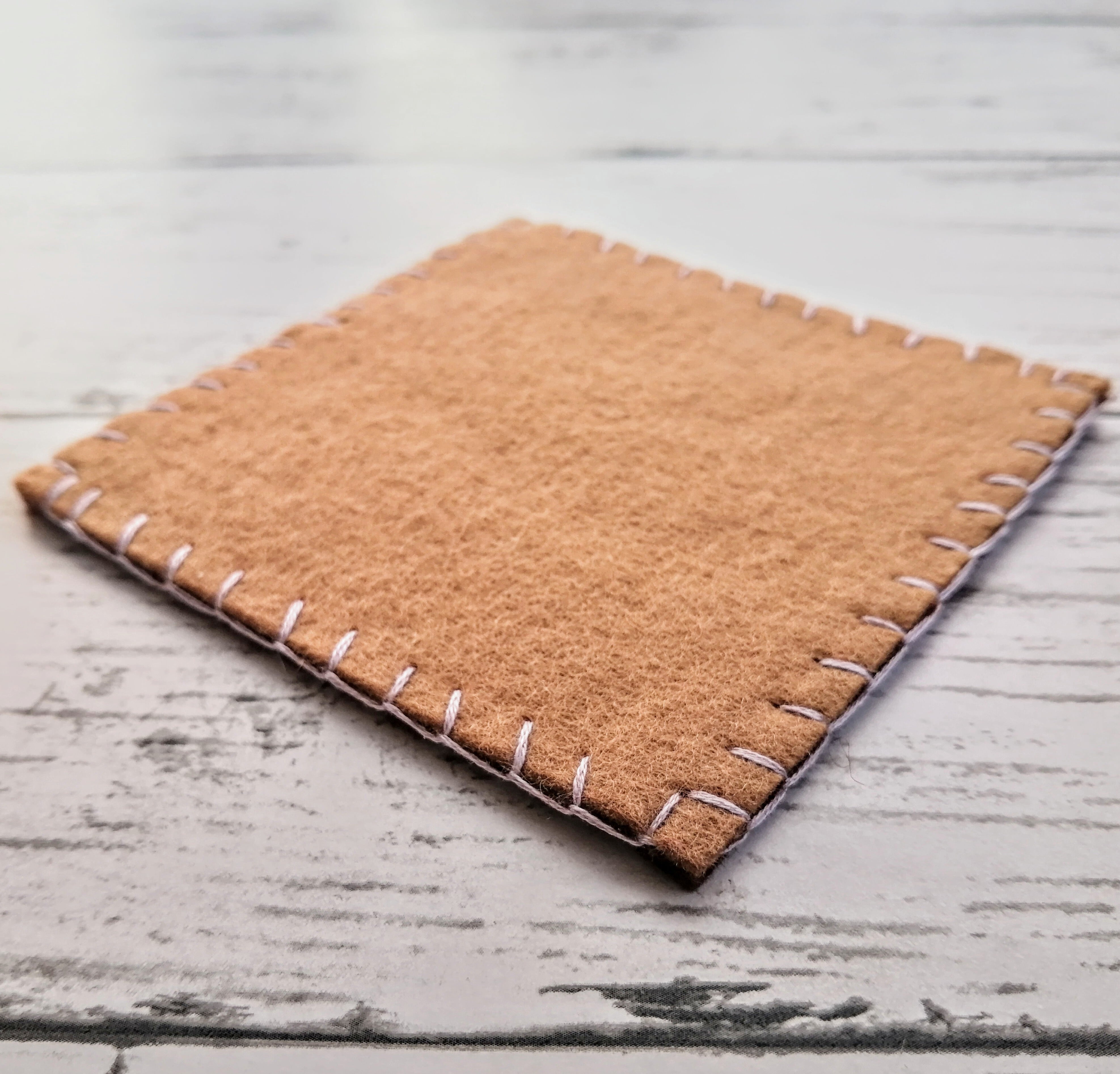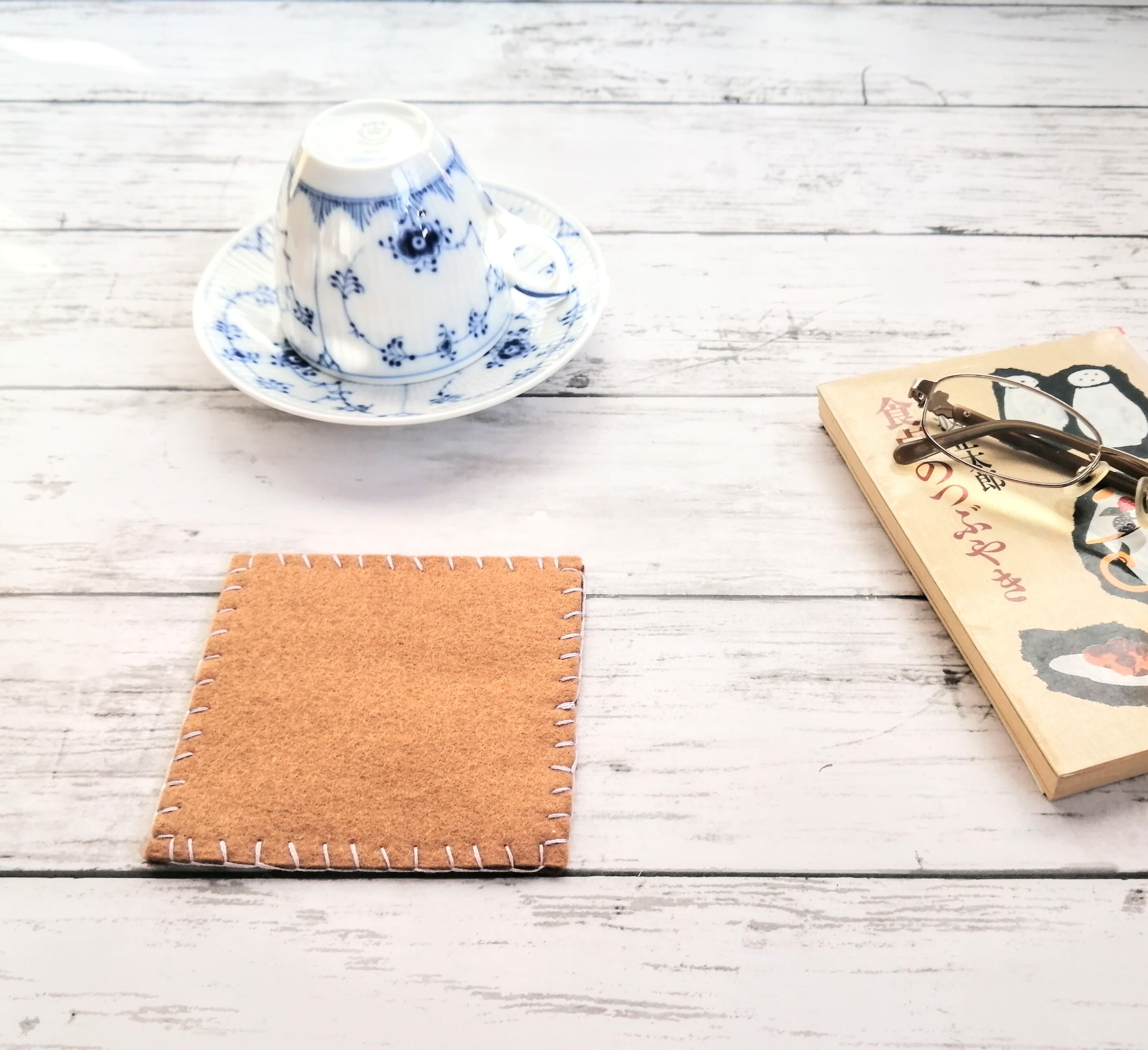 フェルトのシンプルなコースターです。色違いの2枚のフェルトを貼り合わせた後、刺繍糸で押さえました。一針一針丁寧に刺しています。