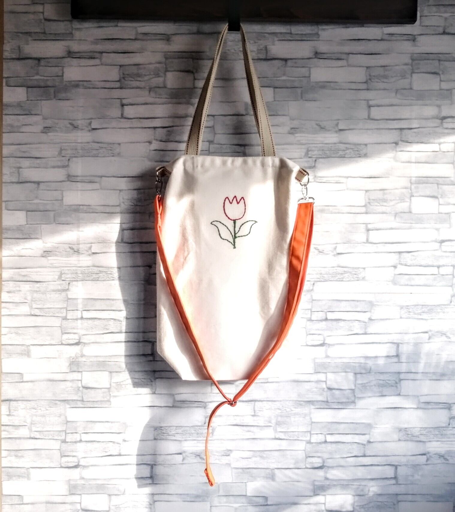 帆布の斜めがけバッグに赤と緑のチューリップを刺繍しました。一針一針心を込めて、手縫いのバックステッチで丁寧に刺しています。