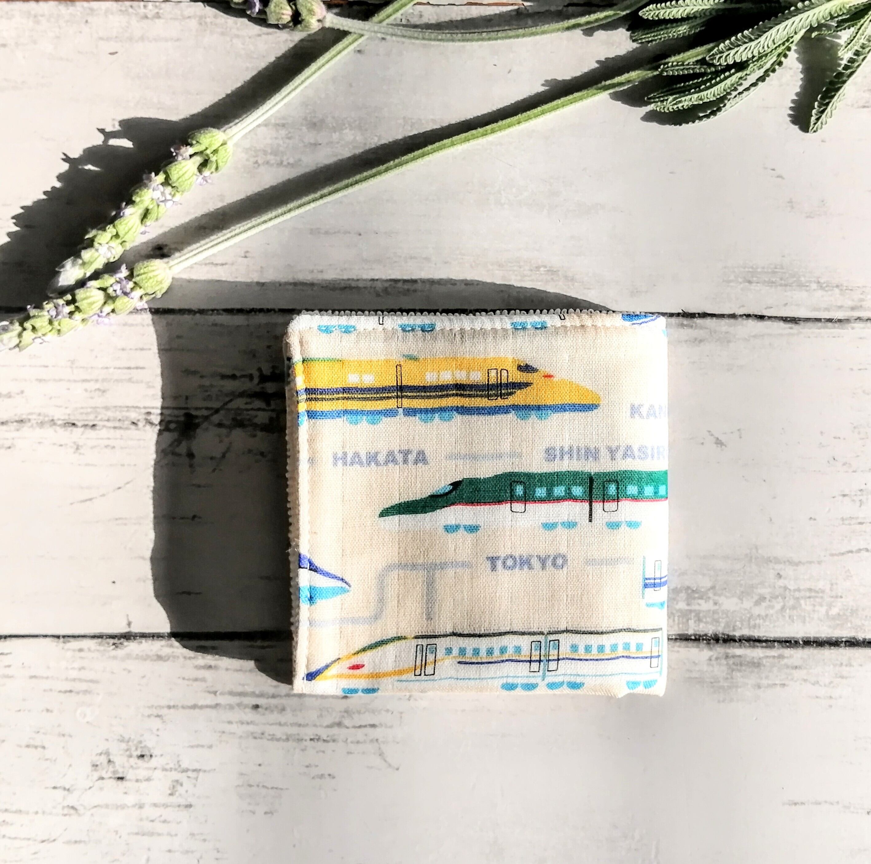 ダブルガーゼにプリントされたいろんな新幹線。畳んだ面にいろんな様子がこんにちは。ワクワクします。