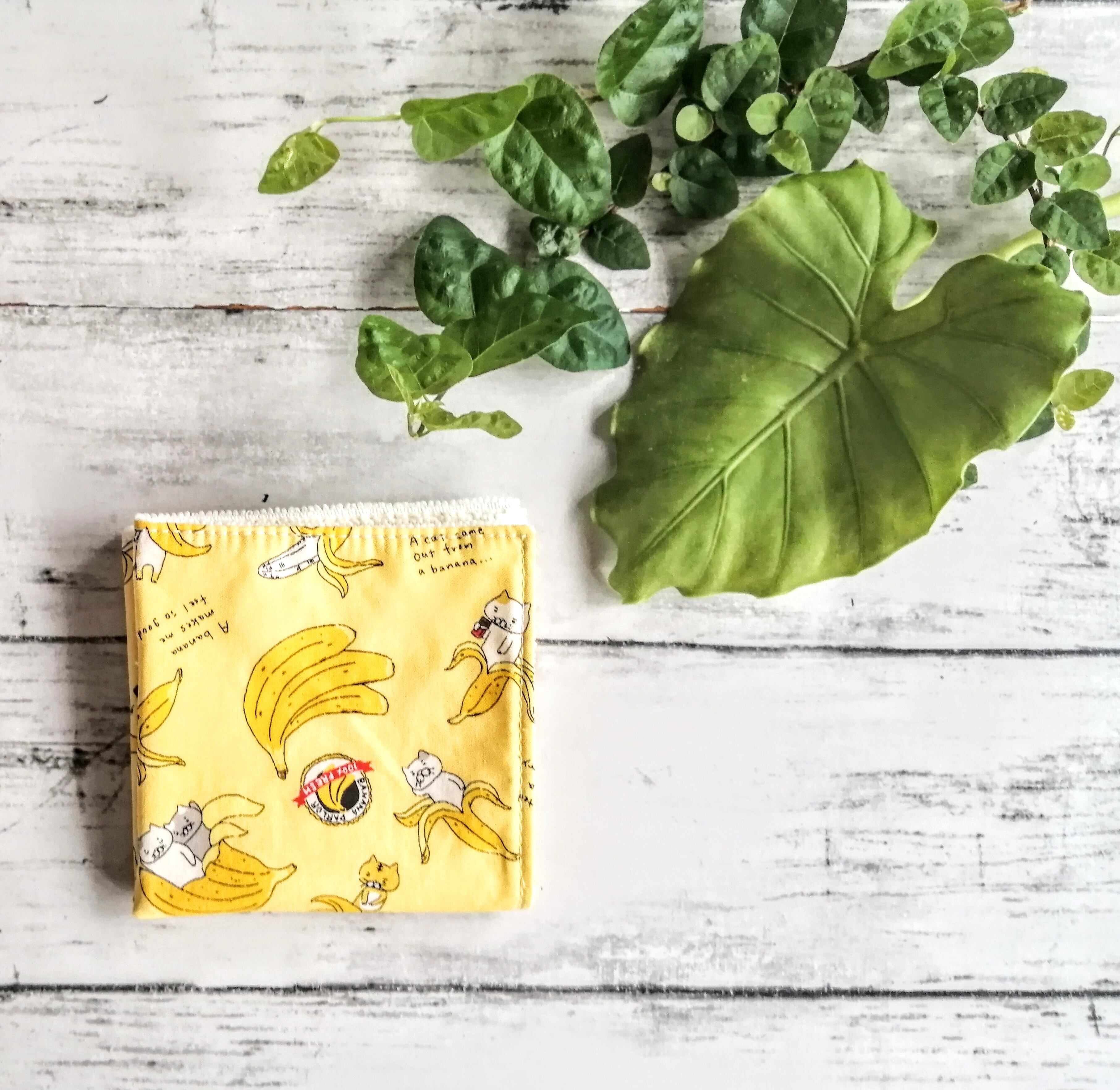 薄いコットン生地とマイクロファイバータオル生地のハンカチです。コットン生地にプリントされたバナナと猫 。かわいいです♪