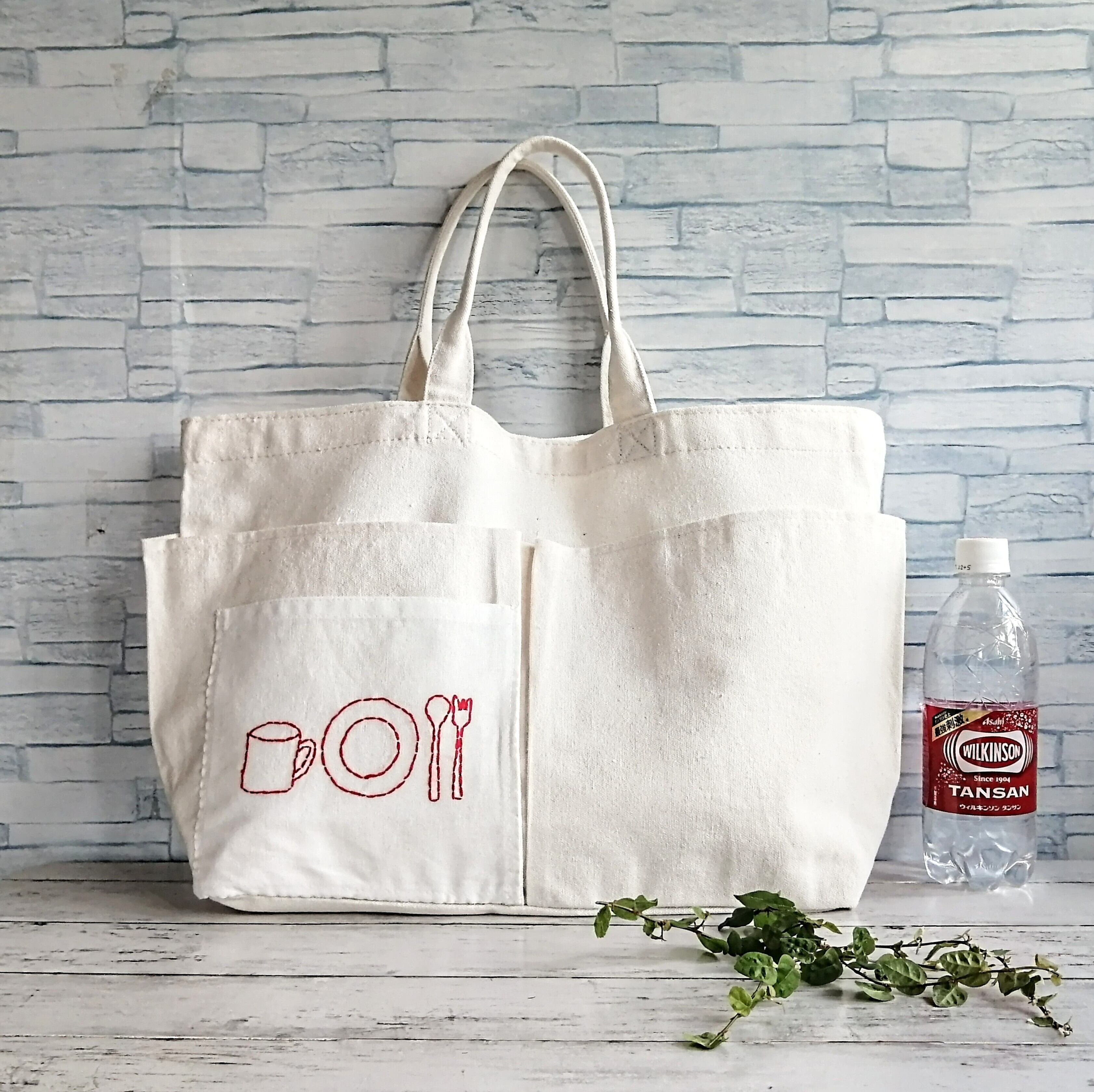 大きいマチの横長トートバッグに赤い食器を刺繍したポケットを付けました。手縫いのバックステッチで丁寧に刺しています。