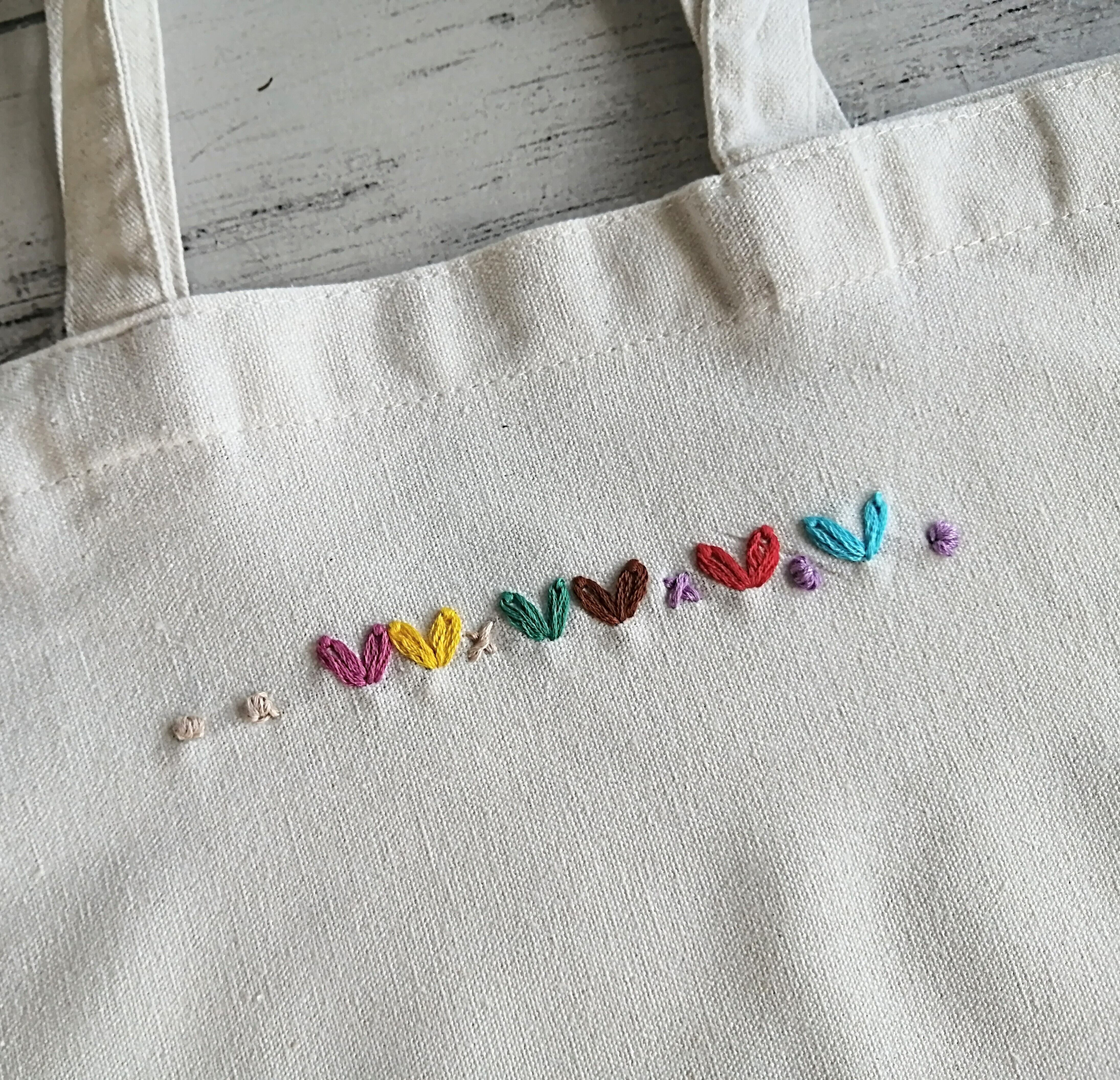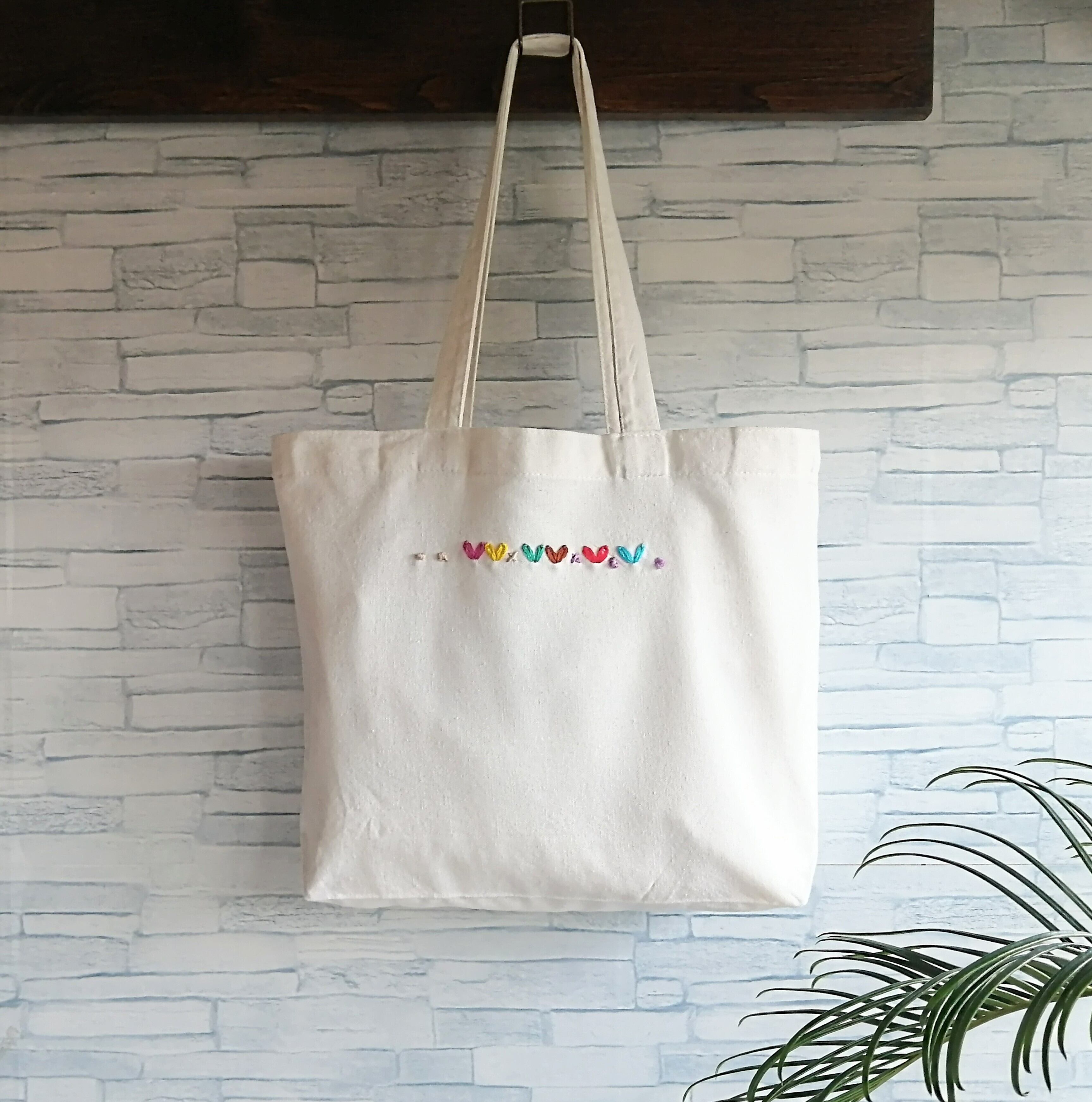 シンプルなトートバッグです。オフホワイトに映える色使いで手縫いの刺繍のハートを並べて見ました。