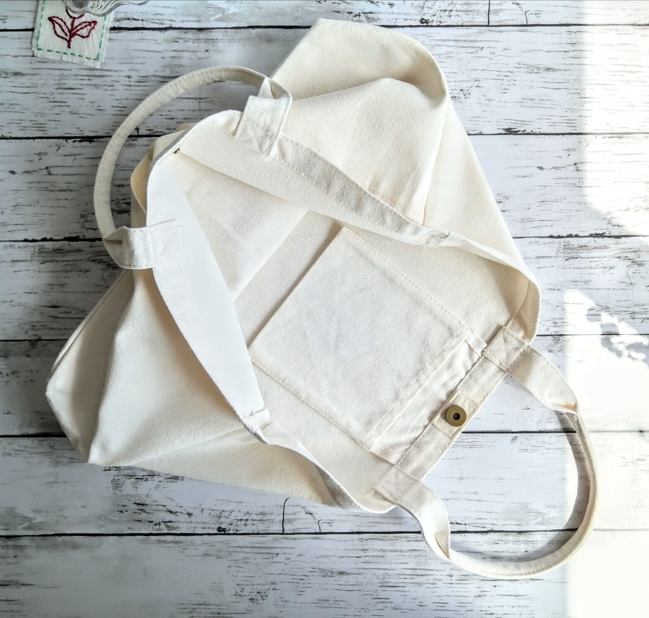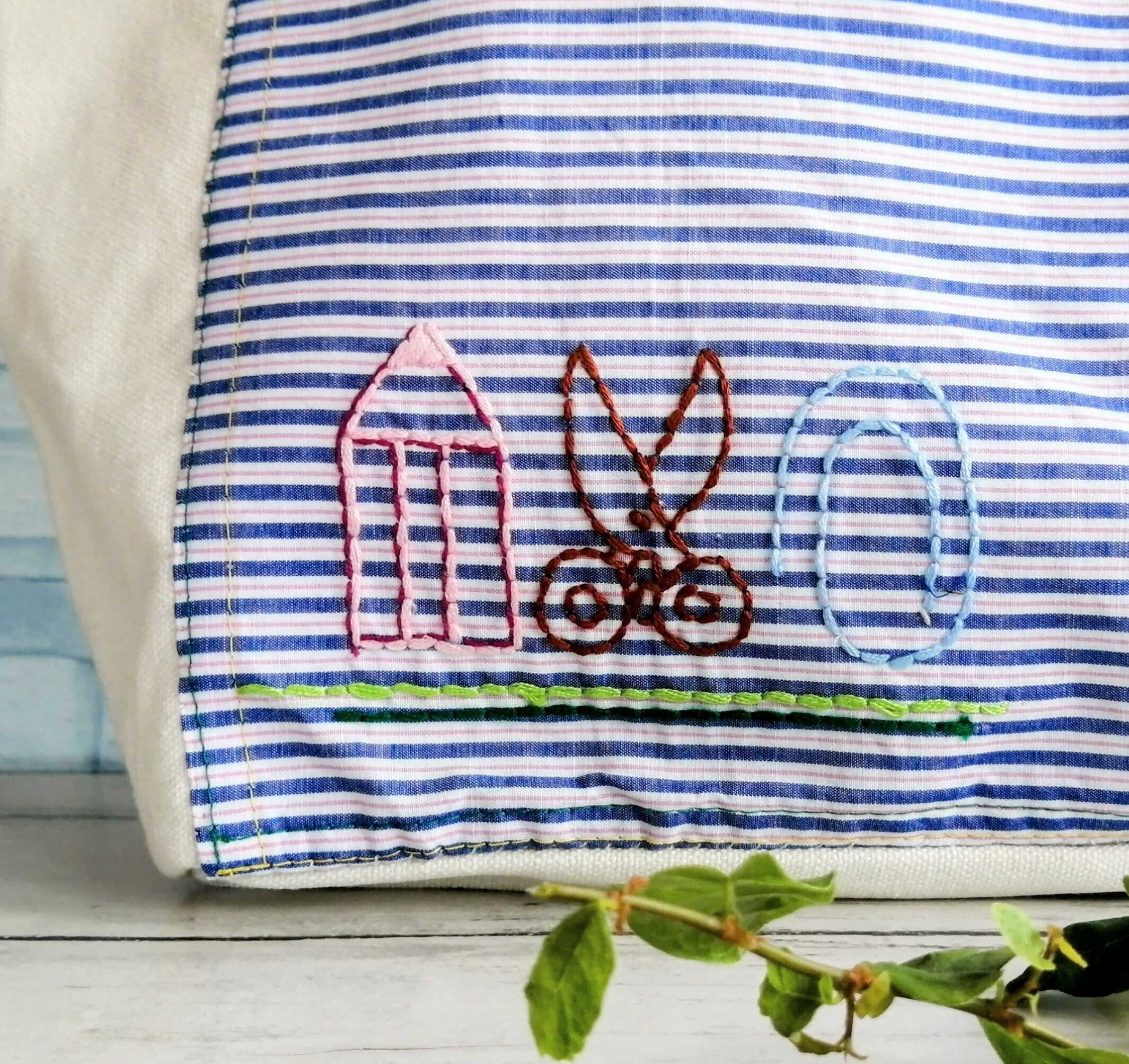 大きいマチの横長トートバッグに文房具を刺繍したポケットを付けました。手縫いのバックステッチで丁寧に刺しています。